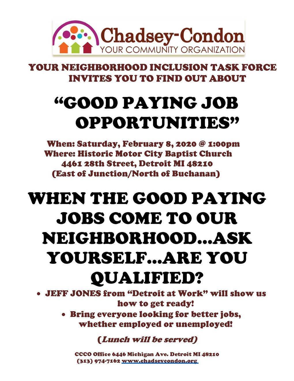 If you are looking for better job opportunities, you do not want to miss this community meeting next Saturday! Stop in, have some lunch, bring a neighbor and get valuable job opportunity information! See you next Saturday! Spread the word!