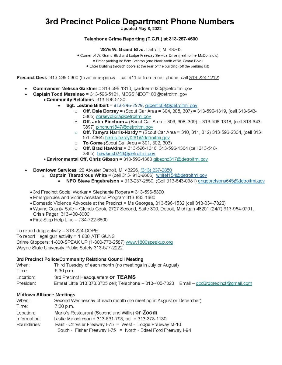 To report drug activity = 313-224-DOPE To report illegal gun activity = 1-800-ATF-GUNS Crime Stoppers: 1-800-SPEAK UP (1-800-773-2587) www.1800speakup.org Wayne State University Public Safety 313-577-2222 3rd Precinct Police/Community Relations Council Meeting When: Third Tuesday of each month (no meetings in July or August) Time: 6:00 p.m. Location: 3rd Precinct Headquarters or TEAMS President Ernest Little = 313-405-7323; cell 313.378.3725; Email – This email address is being protected from spambots. You need JavaScript enabled to view it.