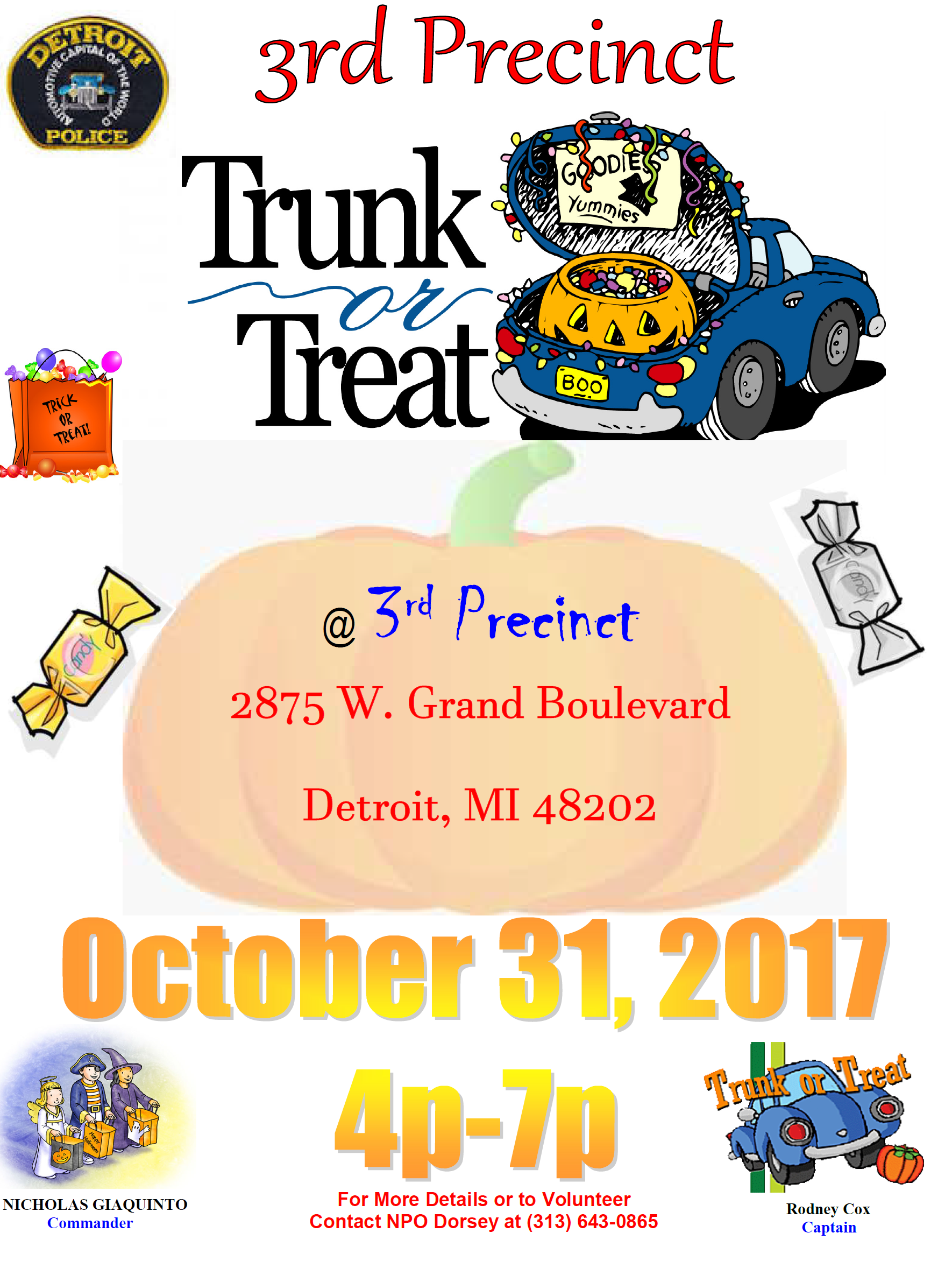 PLEASE VOLUNTEER AND PASS OUT CANDY FROM YOUR TRUNKS AT THE 3RD PCT. ON OCT. 31, 2017. 4P-7P