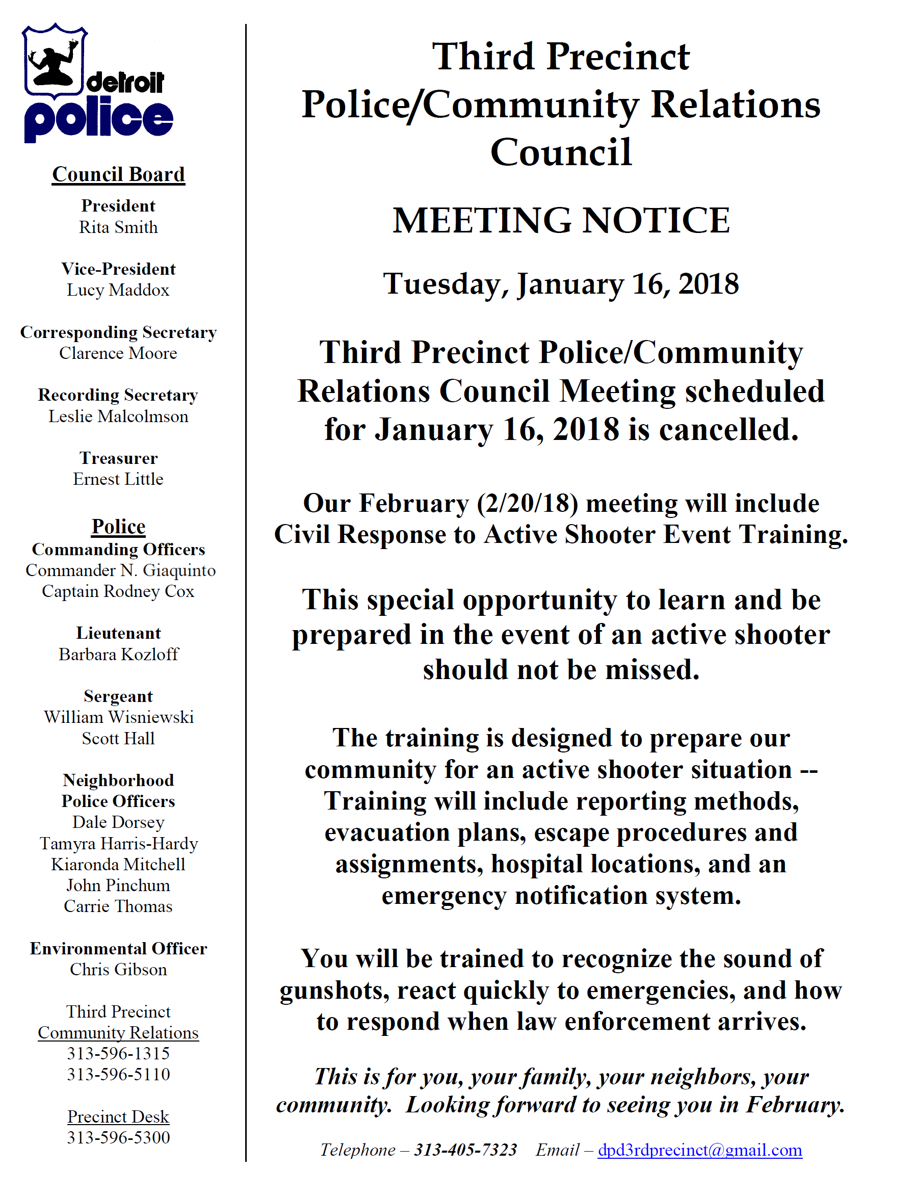 3rd Precinct Police/Community Relations Council January Meeting Cancelled