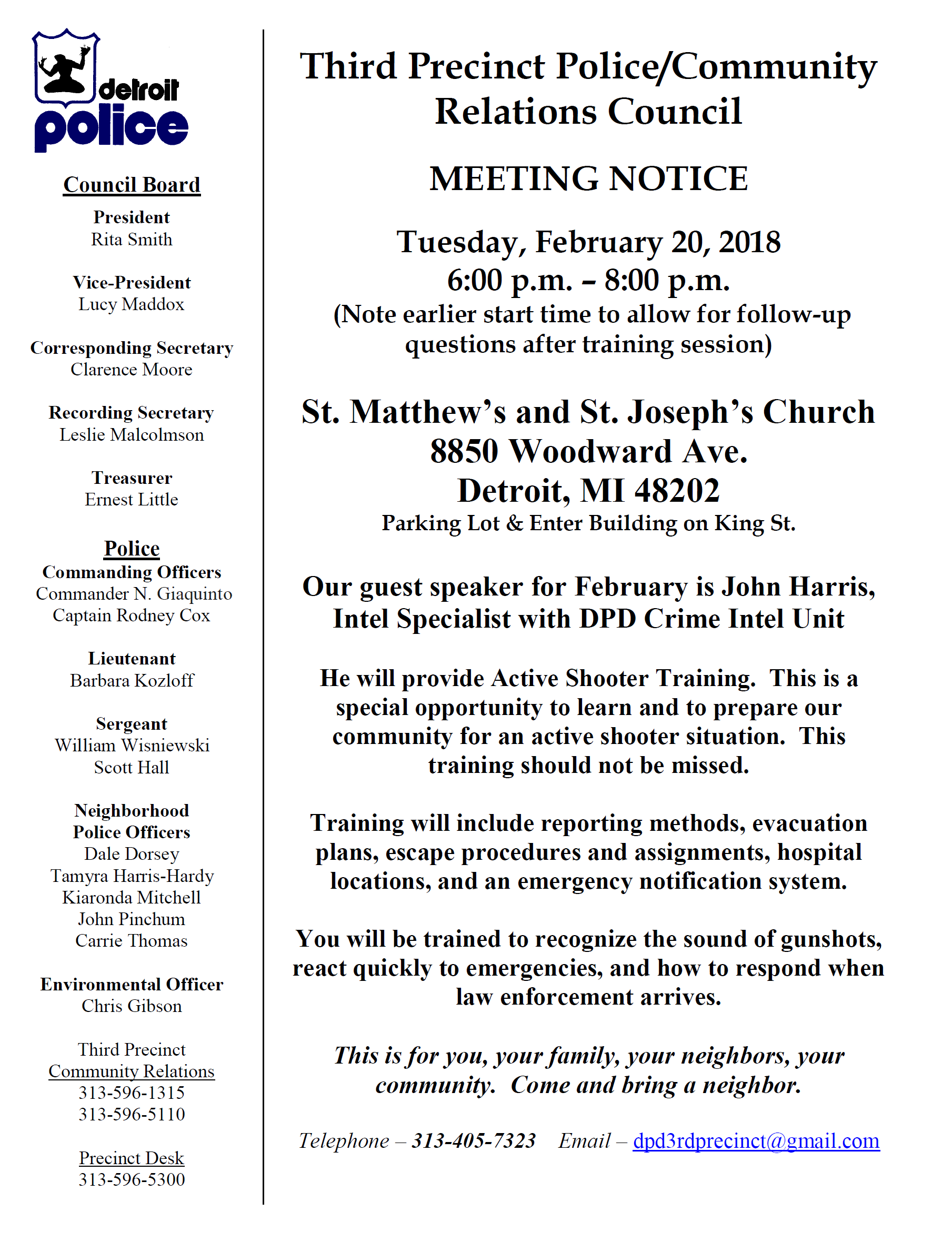 Third Precinct Police/Community Relations Council MEETING NOTICE Tuesday, February 20, 2018 6:00 p.m. – 8:00 p.m. (Note earlier start time to allow for follow-up questions after training session) St. Matthew’s and St. Joseph’s Church 8850 Woodward Ave. Detroit, MI 48202 Parking Lot & Enter Building on King St. Our guest speaker for February is John Harris, Intel Specialist with DPD Crime Intel Unit He will provide Active Shooter Training. This is a special opportunity to learn and to prepare our community for an active shooter situation. This training should not be missed. Training will include reporting methods, evacuation plans, escape procedures and assignments, hospital locations, and an emergency notification system. You will be trained to recognize the sound of gunshots, react quickly to emergencies, and how to respond when law enforcement arrives. This is for you, your family, your neighbors, your community. Come and bring a neighbor. Telephone – 313-405-7323 Email –