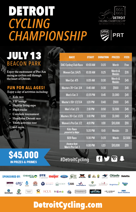 The third annual Detroit Cycling Championship is taking place on July 13, 2019. In its inaugural year, top cyclists from across the country raced throughout the heart of downtown Detroit to compete for the top prize. Following the 2017 race day, USA Cycling (USAC), the national governing body of bicycle racing in the United States, also took notice of the caliber of the event and provided a top A+ rating. In 2018, the Detroit Cycling Championship was part of the Pro Road Tour and will again be included on the tour in 2019.
